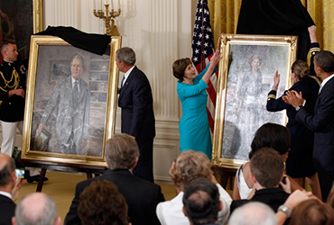 Portraits, Inc., artist John Howard Sanden painted the official portraits of George W. Bush, the 43rd President, and former First Lady Laura Bush. The portraits were unveiled at the White House on May 31st, 2012, at an unveiling ceremony hosted by President Barack Obama and First Lady Michelle Obama.