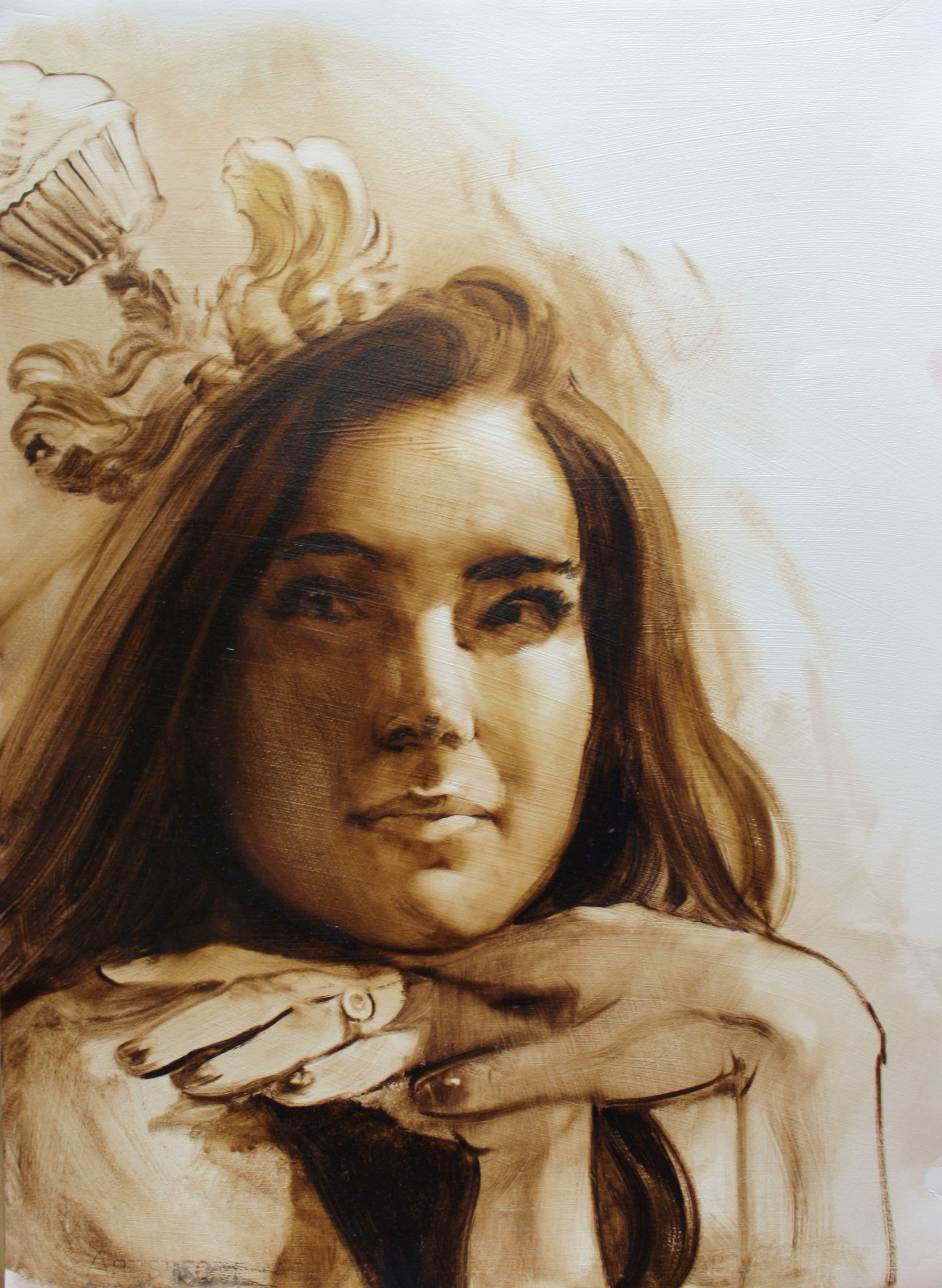Will Cotton, "Brooke's Hands," sepia oil on primed paper, 30 x 22 in.