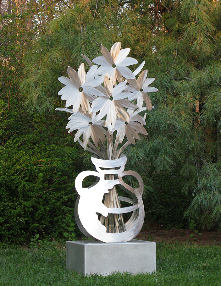 Laser-cut industrial grade stainless steel sounds pretty heavy duty—and in fact Bloch’s fabrication process isn’t a light-weight production. The material is meant to stand up to the elements. But nothing of the work expresses heaviness; the genius of Bloch’s sculptures, which bounce-back light and twist and turn in space, is that they retain, like the flowers they reference, the ephemeral delicacy of her initial process drawings and paper cutouts.