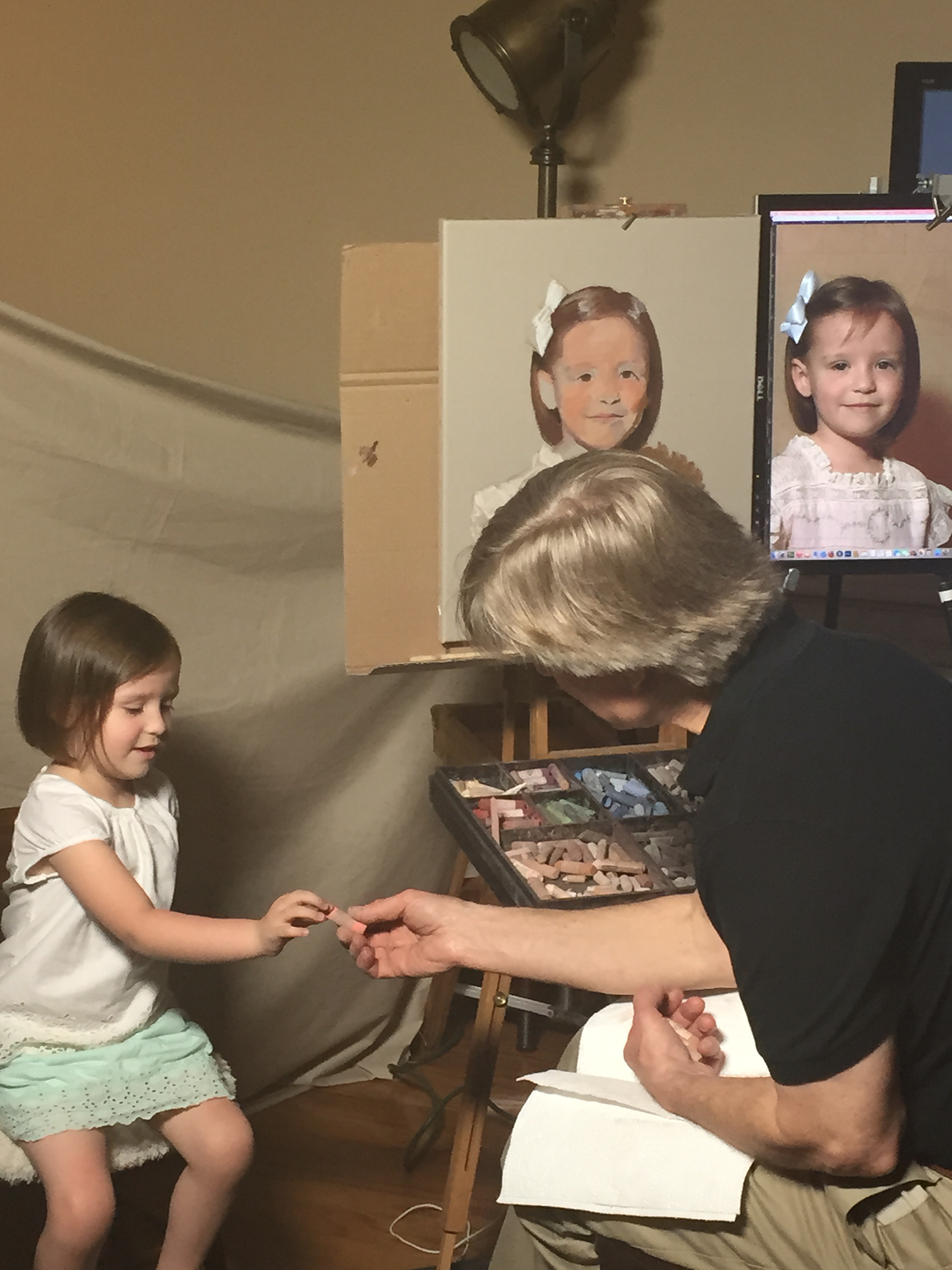 Most artists will take many photographs to supplement their drawings and color studies because it is difficult for people to be available for the number of sittings required to complete a portrait. The artists might also ask to borrow the subject’s dress or suit so they can fill in details when the person is not available to pose.