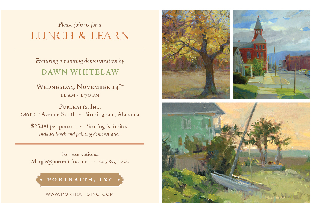 Portraits, Incorporated will host a fall Lunch & Learn featuring artist Dawn Whitelaw on Wednesday, November 14th from 11 am to 1:30 pm. Space is limited. For reservations or more information, call (205) 879-1222.