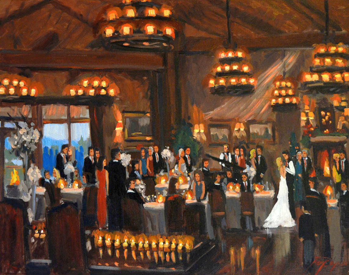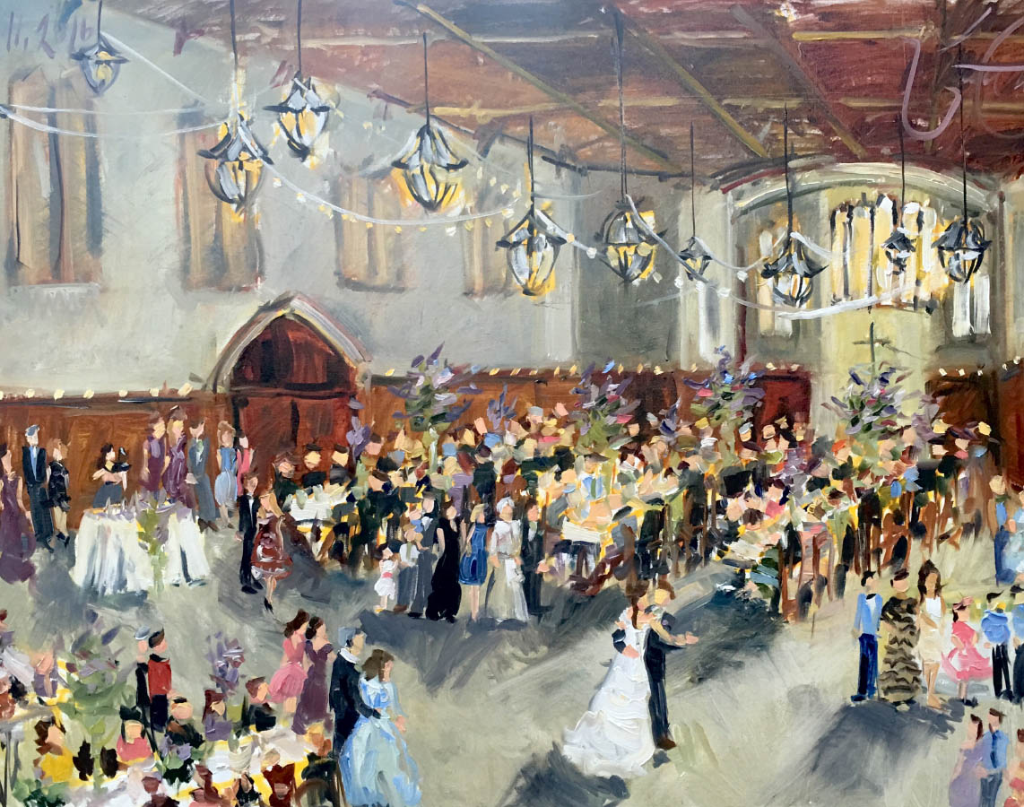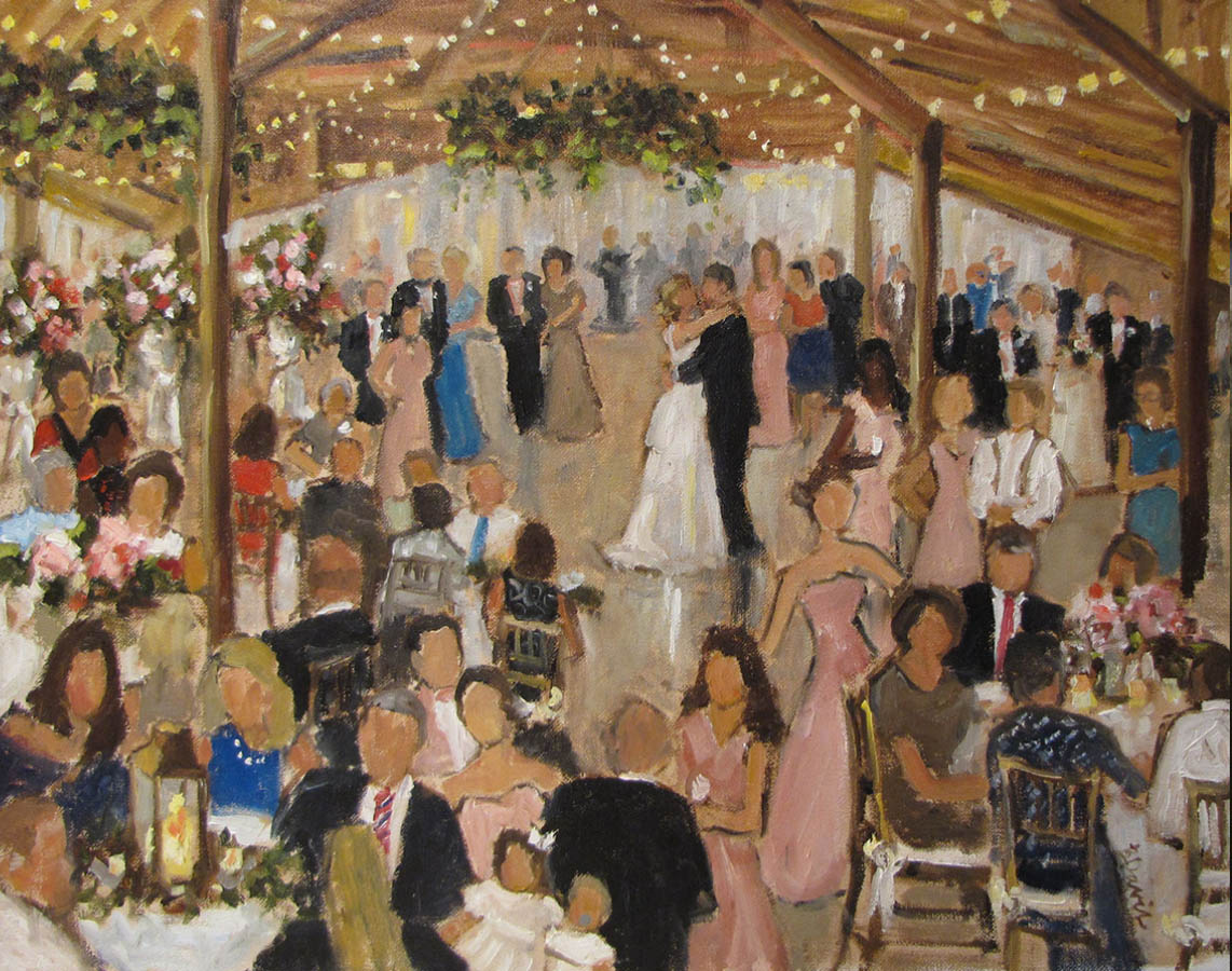 After choosing the central focus, the artist will use his or her creativity in the moment to capture the feeling of your celebration. Whether your event will be grand or intimate, the artist will capture the full depth and scale of the celebration. He or she will manipulate the light to create the most beautiful version of the event. If there are certain people who you really want to have included in the painting, the artist can add them.