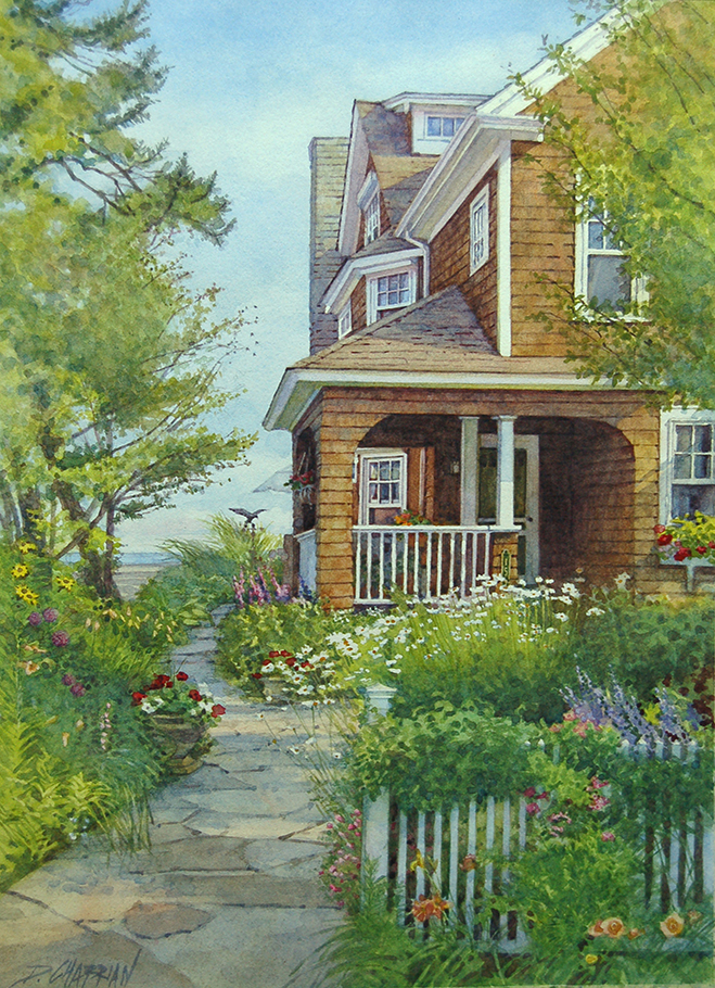 Consider Portraits, Inc. artist Deborah Chabrian, an award-winning watercolorist well-known for her portraits of houses, gardens, and interiors. Like portraitists who focus on people as their primary commission subjects, Chabrian is adept at getting a likeness; with sweeping pictorial views and distinct details, she captures the specialness of place and why it is loved and cared for. Architectural rendering, aiming for a realistic view, is not Chabrian’s aim. Instead, her works tell a story—a story about hearth and home—a story about love. One work (pictured above) invites the viewer to meander down a garden path past a white picket fence and borders of white and yellow daisies interspersed with sprays of lavender. A shingled cottage beckons, its roof a jumble of dormers promising cozy bedroom nooks with views of the sea. I imagine this to be someone’s treasured summer retreat—the scene of kite-flying carefree days, beachcombing clam digs, and backyard cookouts.