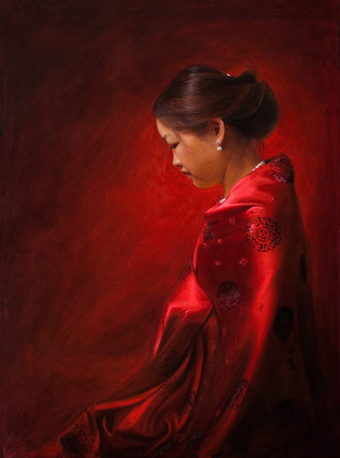 “Étude en rouge”is Wyse’s entry to the upcoming Portraits, Inc. exhibition "Today’s Portraits" opening at the Salmagundi Club on November 14th, 2014. It is also the branding image that graces all the exhibition’s promotions—testament to the work’s allure. The artist tells us that the sitter's name is Dai Yi. She is a young Chinese girl who emigrated from China to study at his studio. The portrait is painted from a combination of life, photographic reference and imagination. Wyse adds, “The color scheme is essentially entirely made up, and the use of such strong reds required massive adjustments to the flesh palette to prevent her from appearing pallid. I loved the traditional Chinese cloth, and wanted to paint all of the shimmering folds. In Chinese culture, red is an auspicious color, symbolizing good fortune and joy. Obviously, I wanted to push the red as far as I could in the portrait, without passing the barrier of abstraction.”
