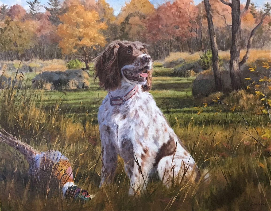 Much of Mr. Woolever’s inspiration comes from the geographic region where he resides. His home studio overlooks a river, which is the perfect setting for his landscape work. Animals have a way of inserting themselves into landscapes, and much of his work has showcased hunting dogs, birds, and other creatures.