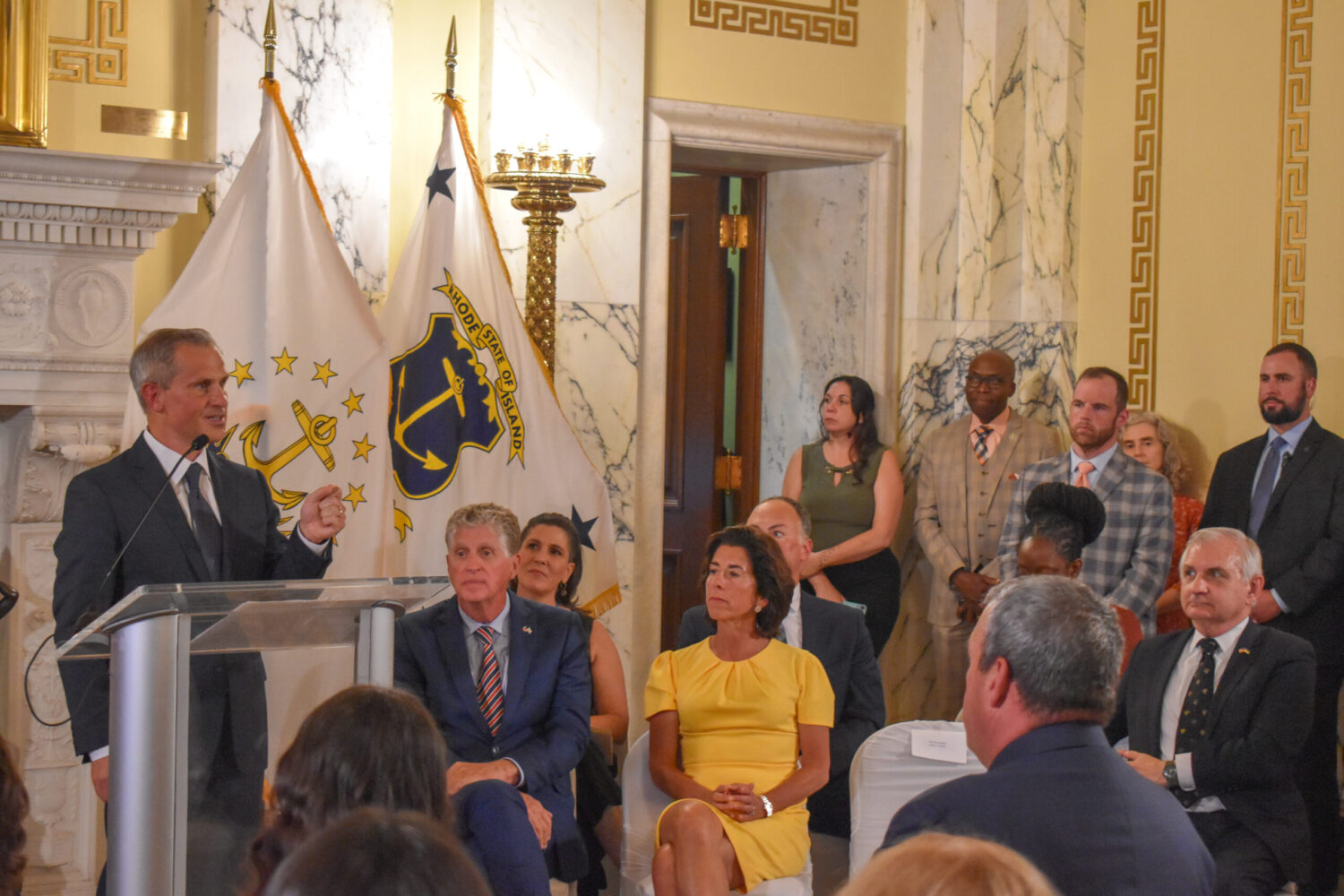 Watwood was present for the official unveiling, seated in the second row in front of the governor’s flag. (Image credit: Christopher Shea/Rhode Island Current)