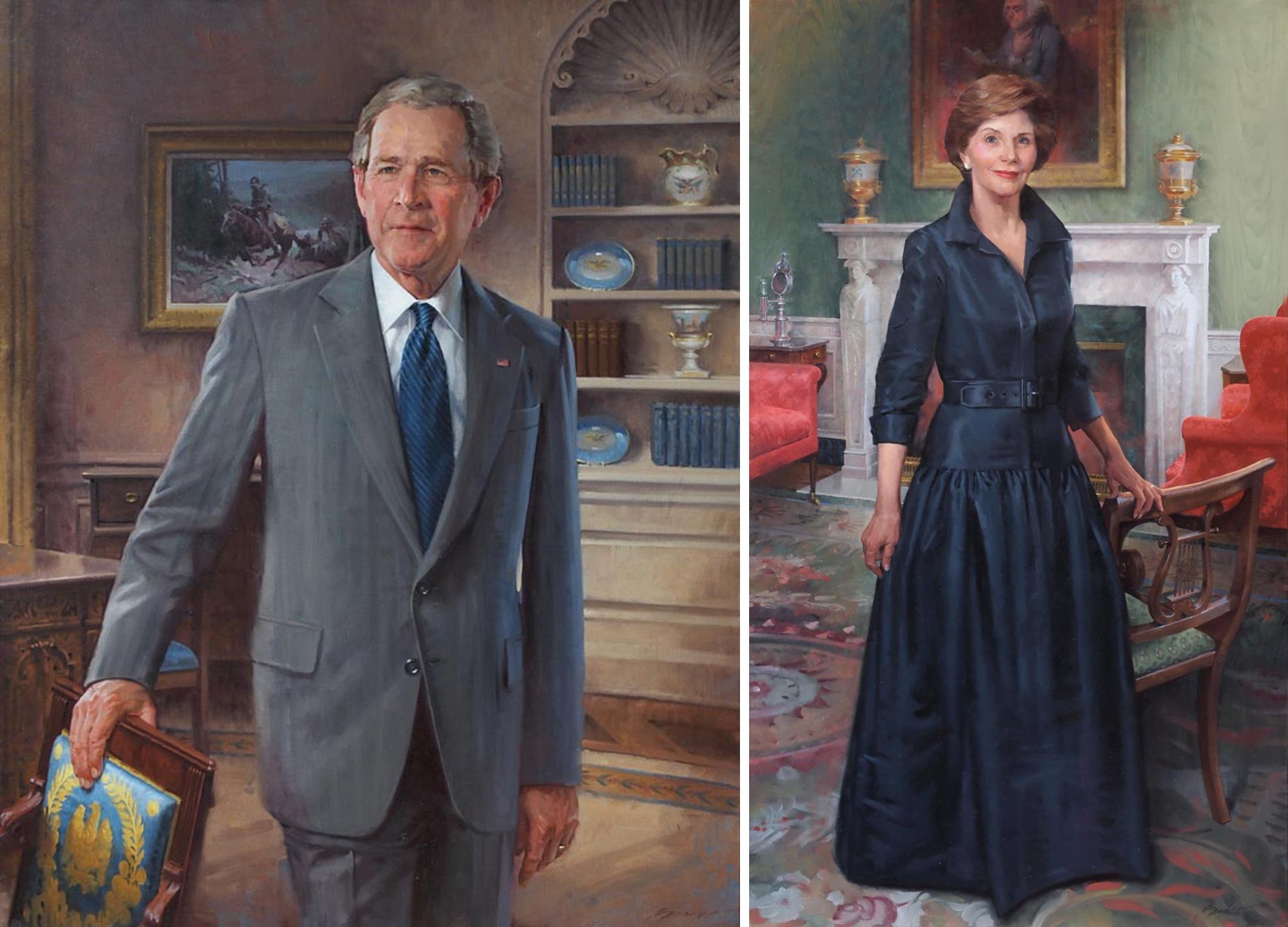 Portraits, Inc., artist John Howard Sanden painted the offical portraits of George W. Bush, the 43rd President, and former First Lady Laura Bush.  The portraits were unveiled at the White House on May 31st, 2012, at an unveiling ceremony hosted by President Barack Obama and First Lady Michelle Obama.