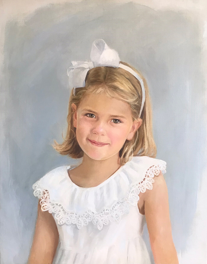 commissioned portrait of a young, red-haired girl holding onto her arm and leaning.